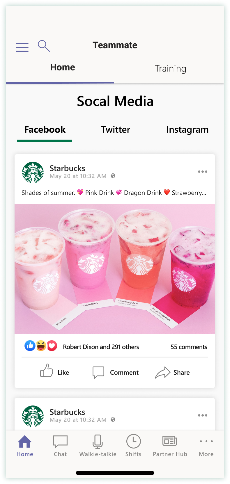 As an additional piece of reassurance and transparency, we decided to include news and company communications front-and-center so that the employees were always aware of updates. We also wanted to promote the brand beyond their response to COVID by including their social media, since the pandemic will end eventually. Promoting their socials on the home page gives the application more personality and can be used as an additional tool for communication.